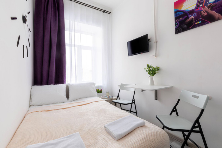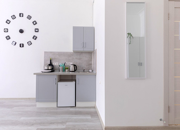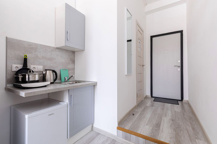 | Студия 2-местная (1-2) | 15 кв.м. | 2 чел. | Мебель (вешалка, зеркало, кровать двуспальная, стол, стулья, шкаф), Мини-кухня, Оборудование (гладил... | |