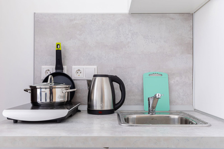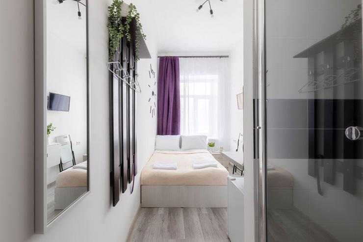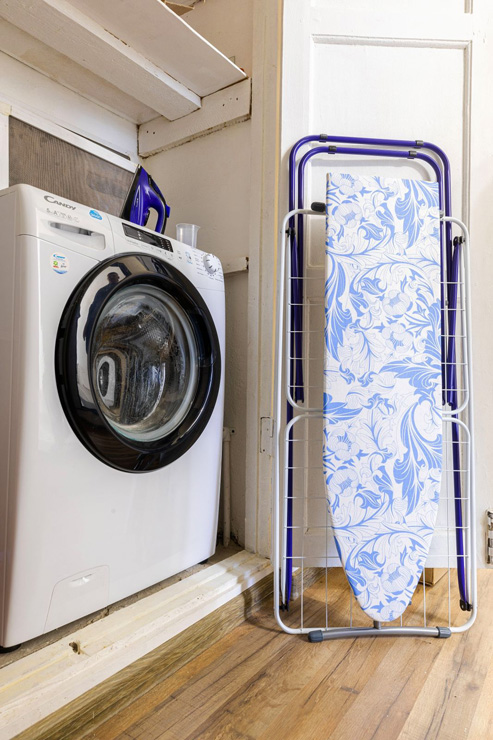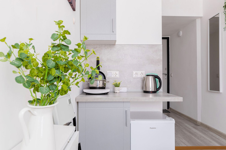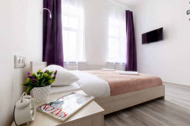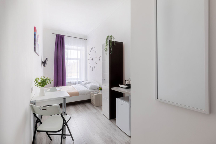 - Оборудование: гладильная доска, мини-холодильник, набор посуды, плита электрическая, стиральная машина, сушилка для белья, телевизор, утюг, электрочайник
