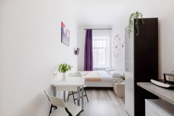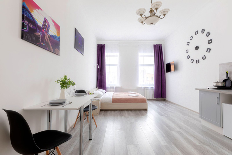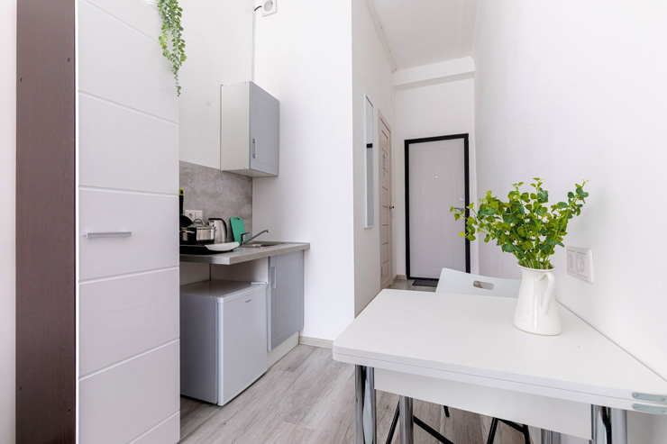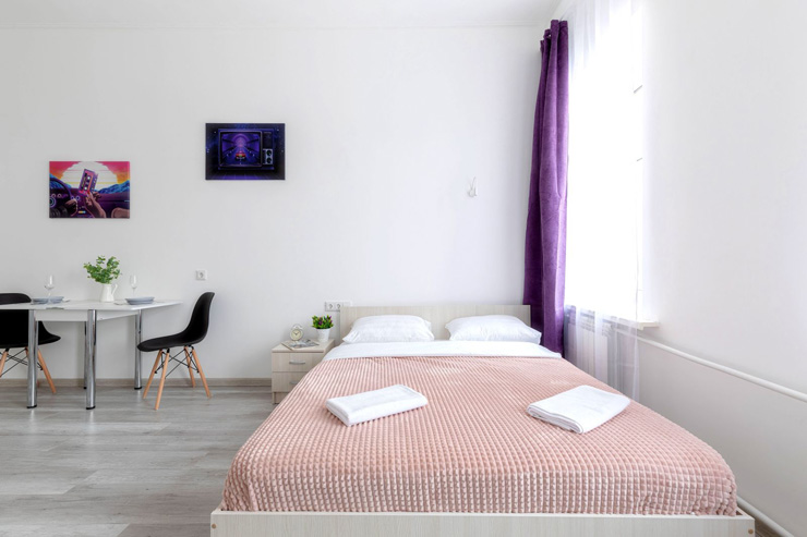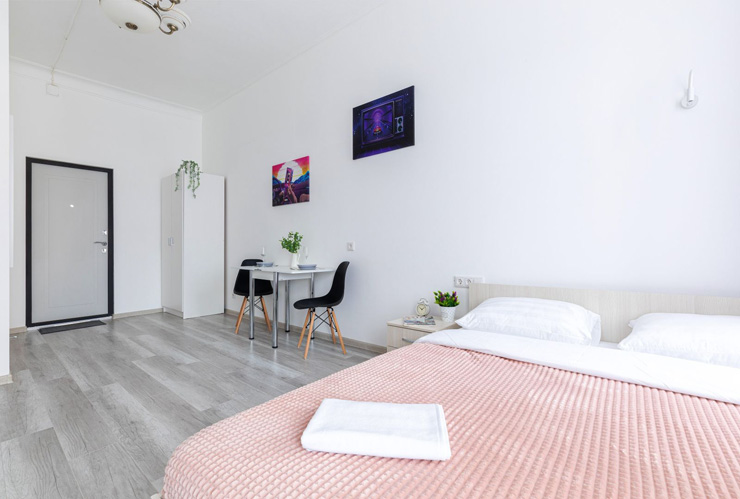 | Студия 4-местная (3) | 27 кв.м. | 4 чел. | Мебель (вешалка, диван раскладной, зеркало, кровать двуспальная, стол, стулья, шкаф), Мини-кухня, Об... |